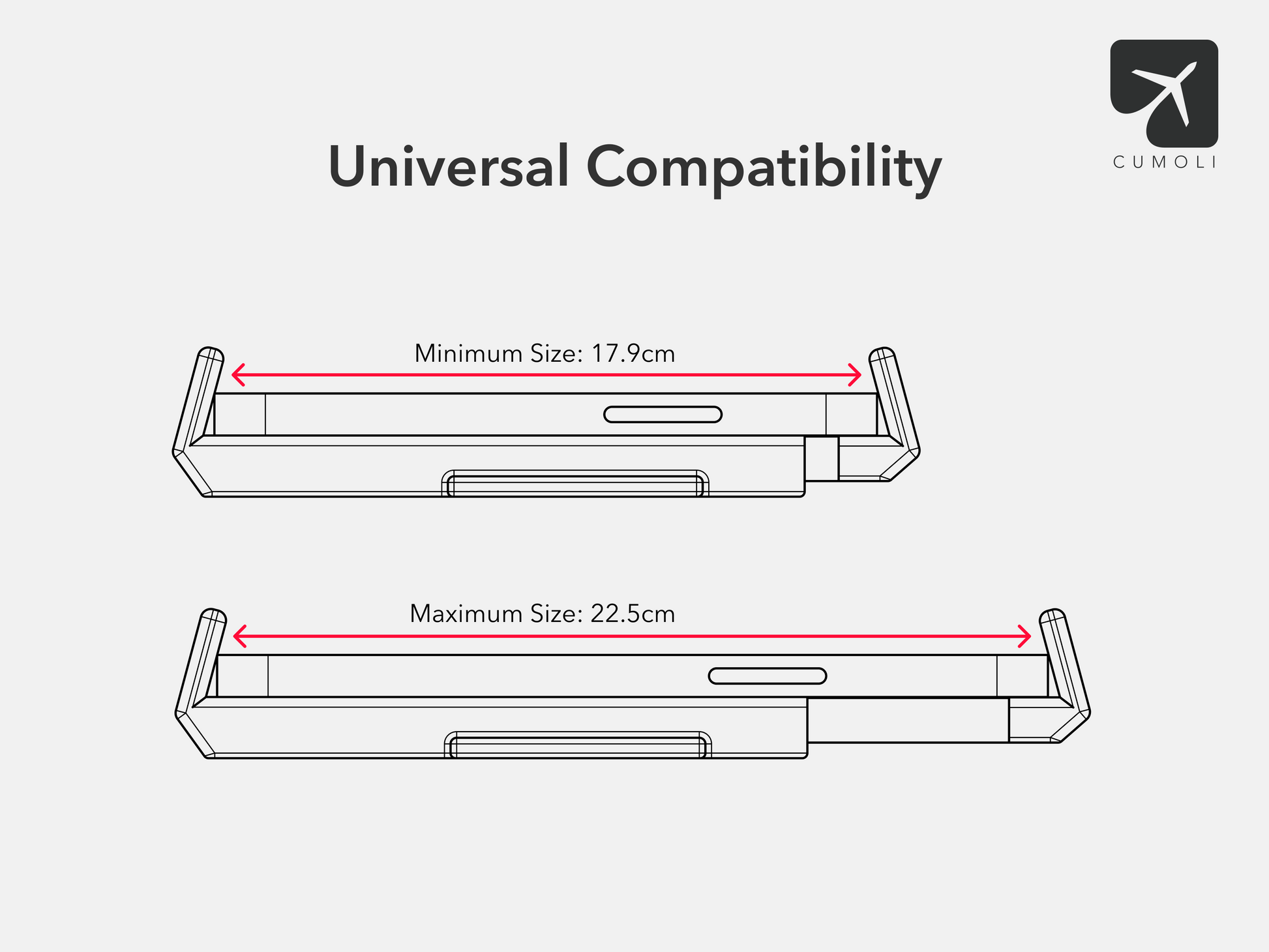 Das integrierte Federsystem passt sich verschiedenen Tablet-Größen bis zu einer Höhe von 22,5 cm (inkl. Schutzhülle) an.